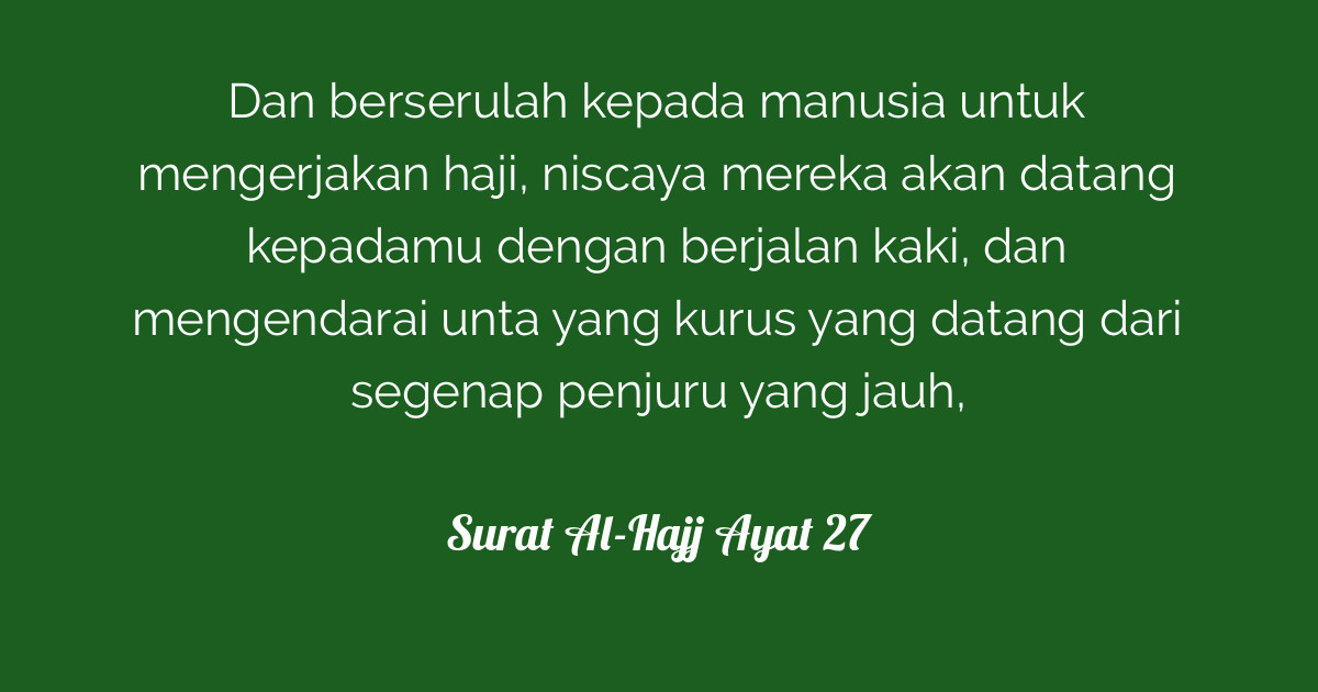 Kelebihan surah al hajj ayat 27. Muslim kitab al hajj bab fardhul hajj marratan fil umr no. Sesungguhnya rabb kalian telah membangun baitullah dan dia telah mewajibkan kalian untuk melakukan haji maka sambutlah seruan rabb kalian ini. They will come from every distant pass. Niscaya mereka akan mendatangimu dengan berjalan kaki atau mengendarai onta yang kurus lantaran kelelahan dalam perjalanan mereka akan datang dengan mengendarai onta dari segenap penjuru yang jauh.