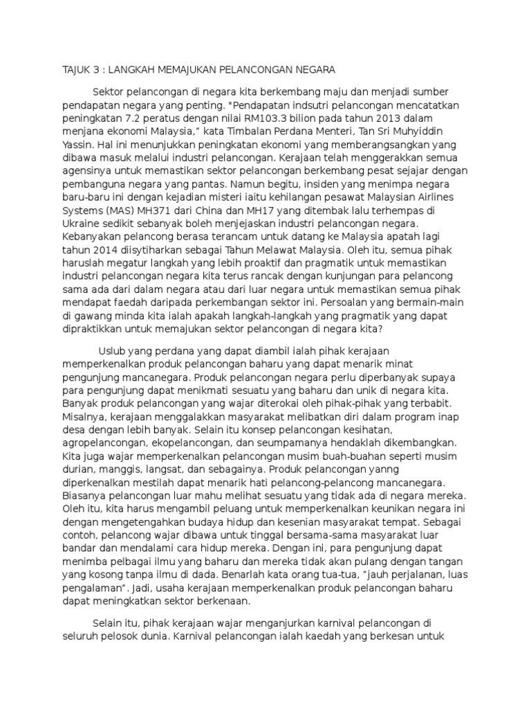 Sebagai panduan pelajar berikut dikongsikan contoh karangan langkah langkah memajukan industri pelancongan negara di malaysia. Usaha usaha memajukan industri pelancongan yang dilaksanakan oleh lppm dengan memperkenalkan negara kita pada dinding 60 buah bas di kota londonpada tahun lalu menunjukan adanya usaha serius. Langkah langkah memajukan industri pelancongan domestik darsawarsa ini pelancongan desa merupakan industri perkhidmatan yang kian berkembang pesat di negara kita pada tahun 2007 purata pelancongan yang berkunjung ke malaysia dianggarkan seramai 20 6 juta orang dengan perolehan pendapatan rm46 2 bilion. Hal ini menyebabkan tempat pelancongan di negara ini dibuka dengan banyak seperti cendawan selepas hujan.